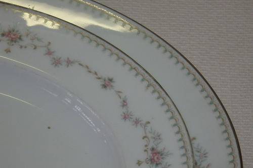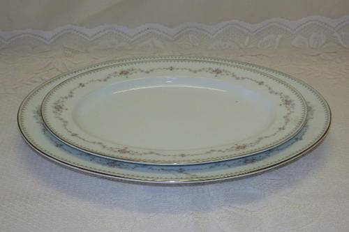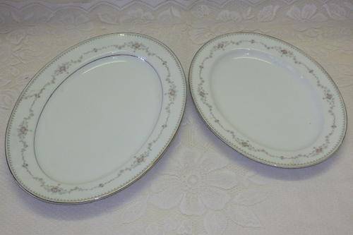 THESE TWO FANTASTIC NORITAKE OF JAPAN "FAIRMONT" PATTERN (6102) BONE CHINA LARGE FOOD PLATTERS MEASURE 29.5cm x 22.5cm AND 35cm x 26.5cm RESPECTIVELY. THE BEAUTIFUL PATTERN OF PINK ROSES AND GREEN DOTS AROUND THE EDGES HAS BEEN EXQUISITELY FINISHED WITH A PLATINUM GILDED EDGE. THERE IS MINOR AGE AND USAGE RELATED WEAR AND TEAR AND TARNISHING ON THE GILDING. THE PLATTERS HAVE NO CHIPS OR CRACKS IN THEM.