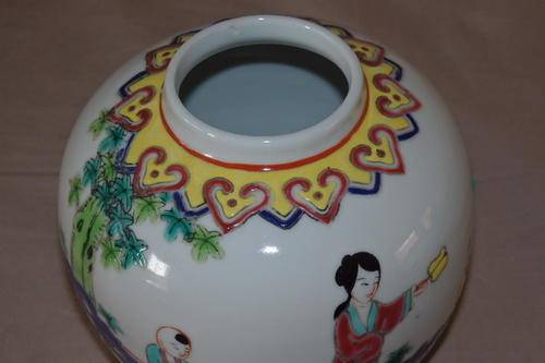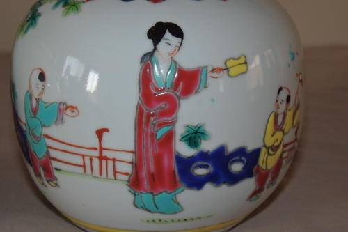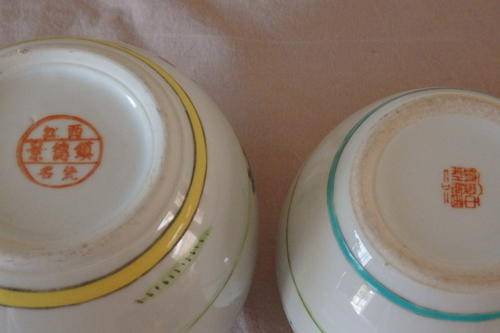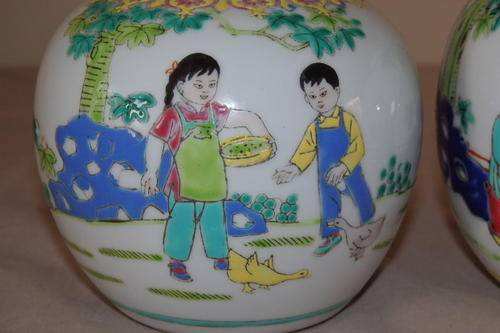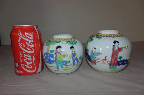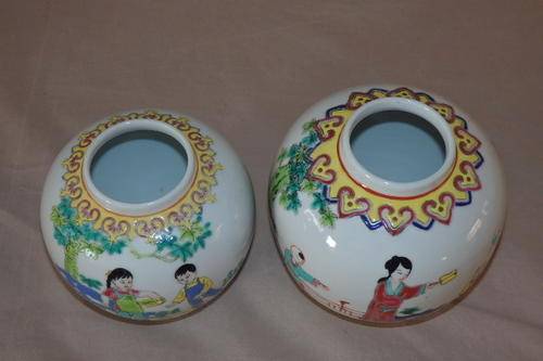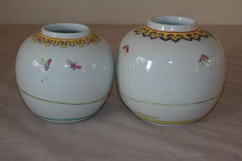 THESE TWO GORGEOUS ORIGINAL HAND PAINTED CHINESE PORCELAIN GINGER JARS ARE IN STUNNING CONDITION AND MEASURE 95mm x 95mm AND 105mm x 105mm RESPECTIVELY. THE JARS HAVE NO CHIPS OR CRACKS OR CRAZING IN THEM. THE ONE JAR HAS A MANUFACTURERS "BUBBLE" ON THE INSIDE OF THE RIM.