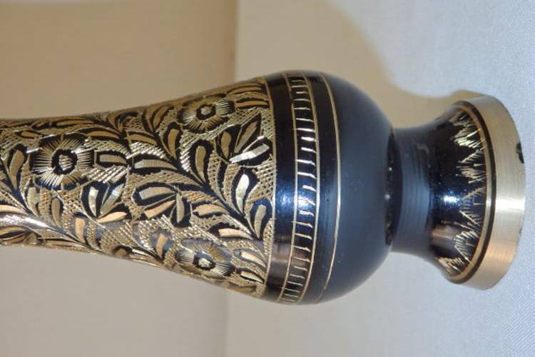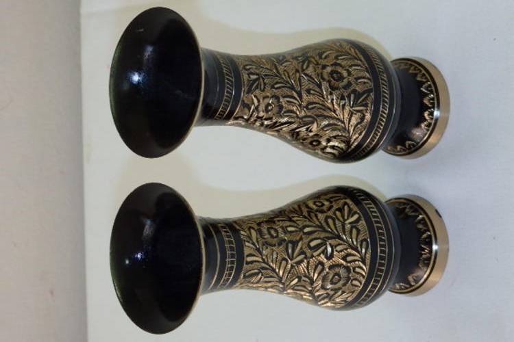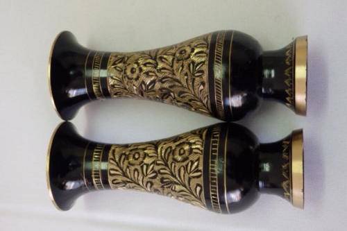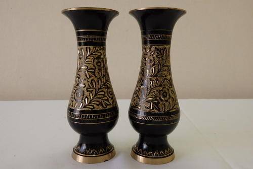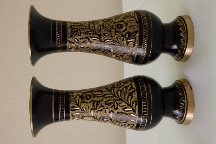 THESE TWO GORGEOUS SOLID BRASS VASES WITH BLACK ENAMELLING AND HAND ENGRAVED DETAILING EACH MEASURE 15cm TALL. THE ENGRAVING EXPOSES THE BEAUTIFUL BRASS UNDERLAY, MAKING THESE TWO VASES QUITE STUNNING. THE VASES SEEM TO BE OF ASIAN ORIGIN.