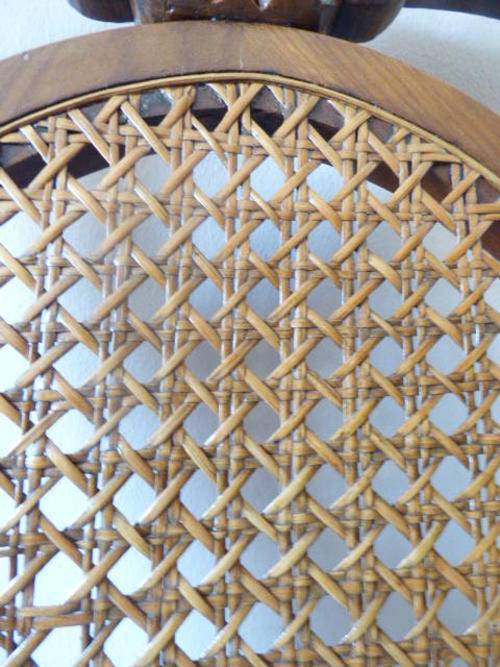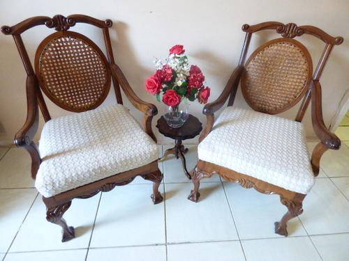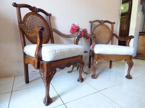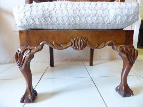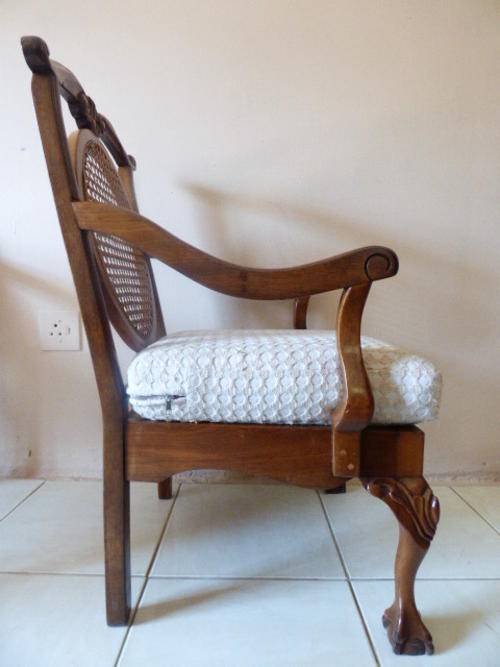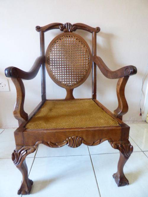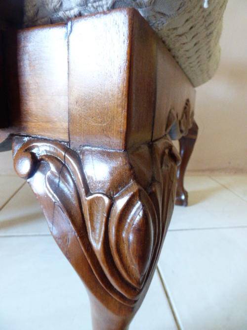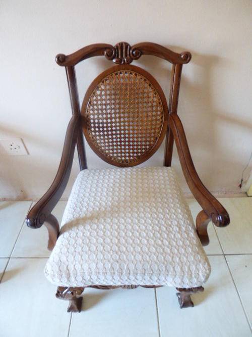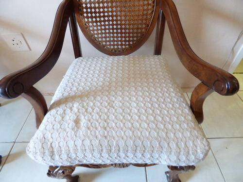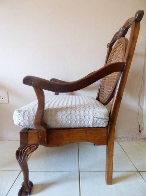 THESE ABSOLUTELY BEAUTIFULLY UPHOLSTERED IMBUIA BALL & CLAW BOW BACK AND RATTAN ARM CHAIRS ARE PERFECT TO PUT IN YOUR READING ROOM/ STUDY/ OFFICE OR ADD TO YOUR BEDROOM DECOR WITH AN OCCASIONAL TABLE. THE CHAIRS ARE STYLISH AND VERY ELEGANT AND BEAUTIFUL IN THEIR DESIGN. THESE CHAIRS WILL ADD STYLE AND CLASS WHEREVER YOU CHOOSE TO HAVE THEM IN YOUR HOME. THEY MEASURE APPROXIMATELY 54cm x 60cm x 98cm HIGH. Please note that all four front legs have had a minor repair to them as seen in the 12th pic.