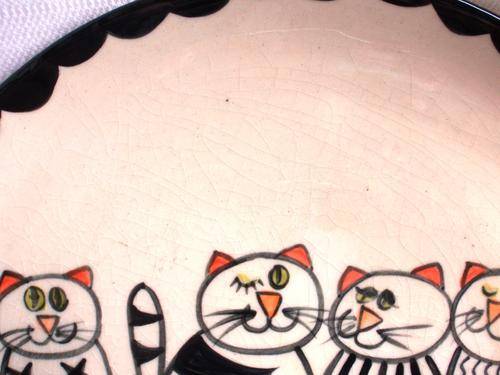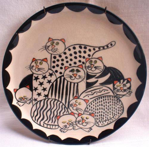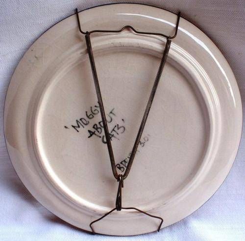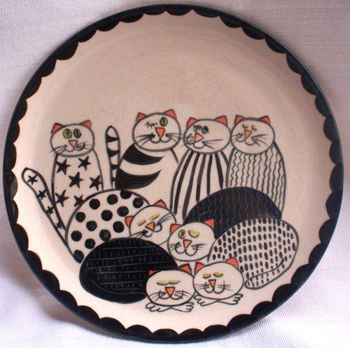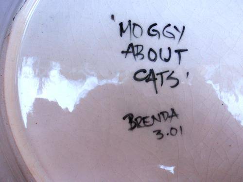 A SET OF TWO HAND PAINTED DECORATIVE PLATES (WITH WALL HANGING DEVICE ON EACH ONE) THEY ARE A SERIES OF 'MOGGIE ABOUT CATS' BY BRENDA DATED 3.01. SIZE OF EACH PLATE: DIAMETRE 23CM X HEIGHT 2.5CM