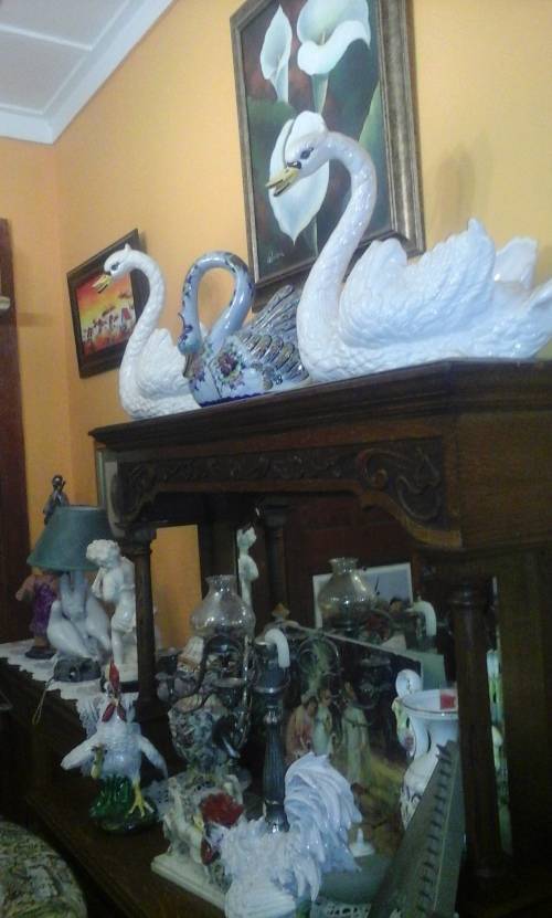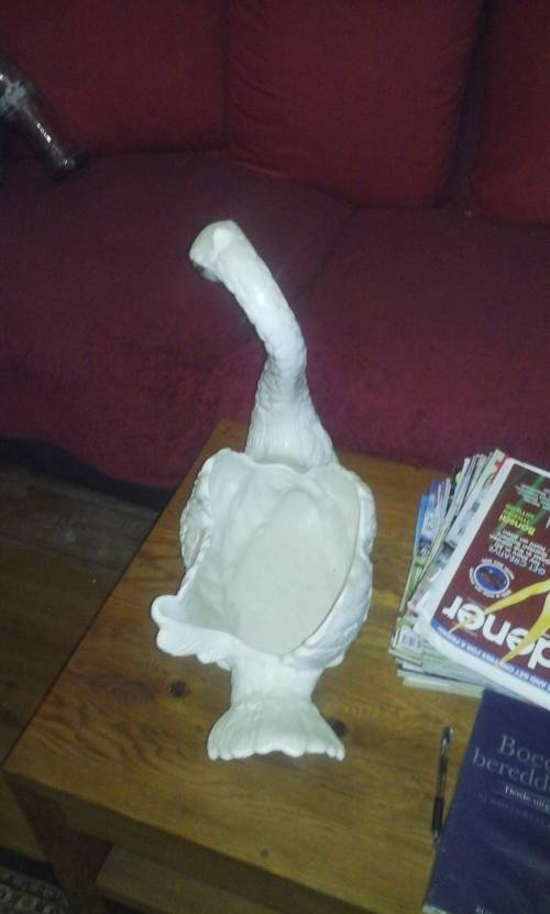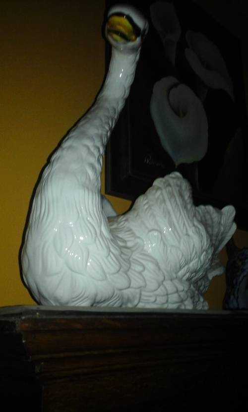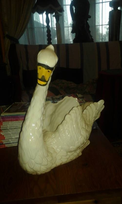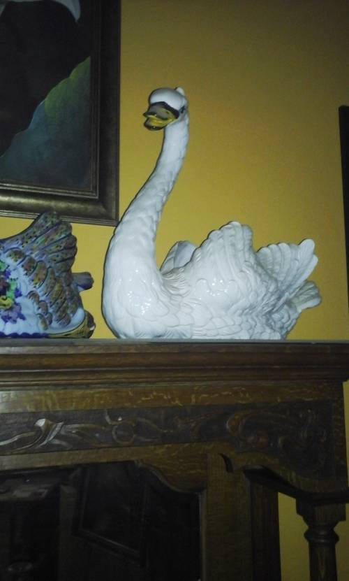 Two lovely white swans.they are in near perfect condition.very old, no chips no cracks. They are about 500mm long and the height you can see where a 1.25 coke bottle is pictured with it. There is no makers mark but that does not detract from its beauty.