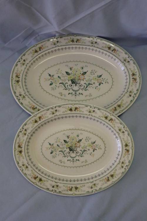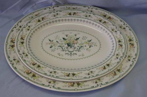 THESE TWO SPECTACULAR ROYAL DOULTON "PROVENCAL" (TC1034) PATTERN BONE CHINA LARGE FOOD PLATTERS MEASURE 33.3cm x 25.8cm AND 40.5cm x 35.8cm RESPECTIVELY AND ARE IN FABULOUS CONDITION WITH NO CHIPS OR CRACKS IN ANY OF THE PIECES. THE GORGEOUS GREEN AND WHITE LACE AND SCROLLS DESIGN WITH FLORAL DETAILING MAKES THIS AN INCREDIBLY ELEGANT YET "SUMMERY" DESIGN. THE PATTERN WAS MANUFACTURED BETWEEN 1967 AND 1997 AND STILL REMAINS A HUGELY DESIRABLE SERVICE. THIS IS A MAGNIFICENT FIND!!!