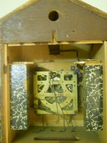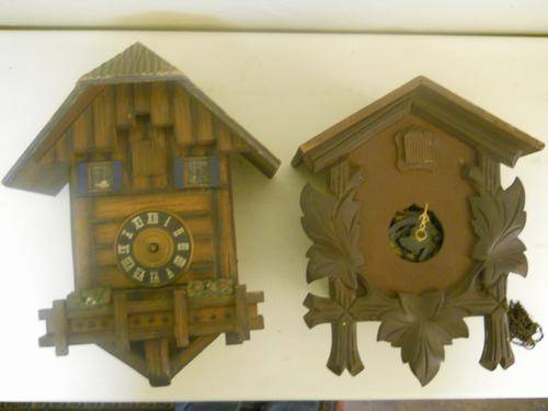 MOVEMENTS IN REPAIRABLE CONDITION. ONE CLOCK MISING A DAIL AND ONE HAND; ONE WITHOUT EITHER HANDS. WIND-BOXES BROKEN. NO WEIGHTS ON EITHER AND ONLY ONE CLOCK WITH CHAINS. AS IS.
