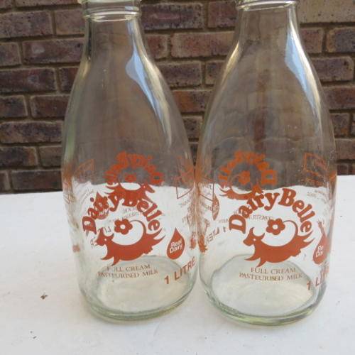 TWO OLD DAIRY BELLE ONE LITER MILK BOTTLES IN CARRYING TRAY