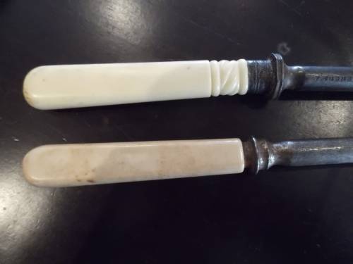 Two old Knife Sharpeners very used. One has forged steel made in England the other T.Turner & Co. which is bone. Post Office with tracking number. R65 due to the length. Or Post Net R120.
