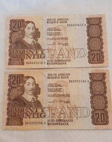 Two old South African "CL Stals" (1989-1999) 20 Rand notes