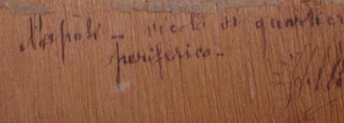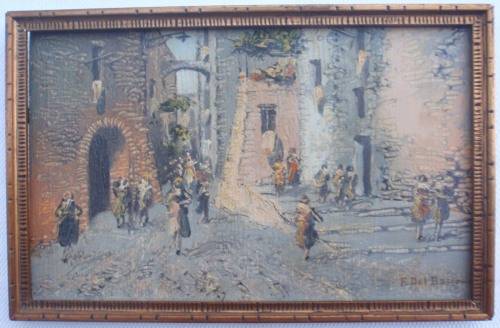 TWO ORIGINAL OILS - MINIATURES by ITALIAN ARTIST (1887-1973) FERNANDO DEL BASSO. FOUR SIMILAR SMALL WORKS OF THIS ARTIST HAVE SOLD AT CHRISTIES OF LONDON IN 2011 FOR 1,500 GBP. HE IS FAMOUS FOR HIS SCENES OF NAPOLI. THESE WORKS ARE VERY CLEARLY SIGNED ON THE FRONT AND ON THE BACK. DETAILS OF THE PAINTINGS ARE WRITTEN, BY THE ARTIST ON THE BACKS. PAINTED IN OILS ON WOODEN BOARD. SIZE OF EACH PAINTING: 11CM X 7CM (ART WORK ONLY) FRAMED IN ORIGINAL THIN ORNATE GILT FRAMES OF 7mm WIDE.