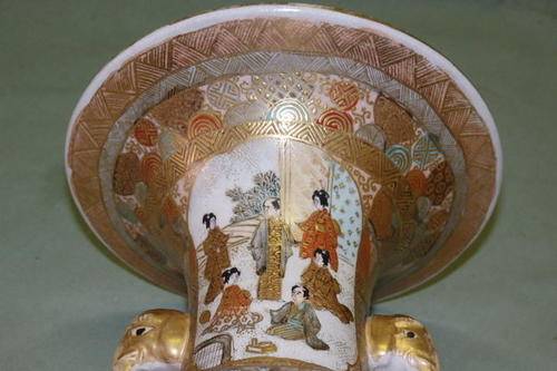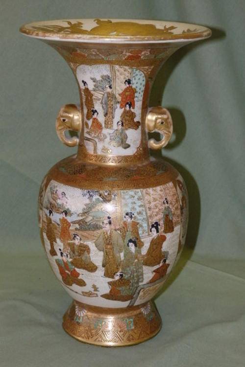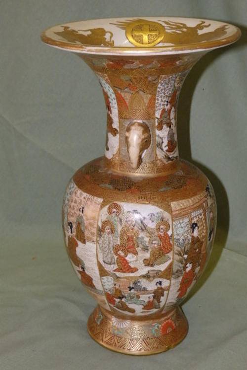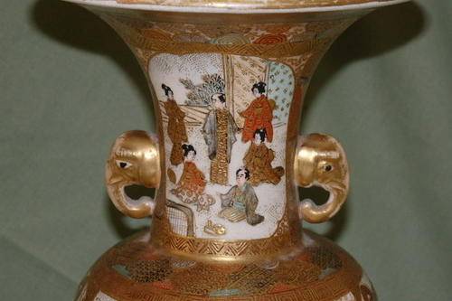 THESE TWO SPECTACULAR AND VERY RARE ANTIQUE (1880 TO 1900) HANDMADE AND HAND PAINTED JAPANESE SATSUMA VASES WITH ELEPHANT HEAD HANDLES EACH MEASURE 25cm TALL AND ARE 14.5cm ACROSS THE RIM OF THE VASES. EACH VASE HAS A SERIES OF TRADITIONAL HAND PAINTED SCENES OF THE PERIOD. THESE VASES SELL FOR MANY R1 000's. I HAVE ATTACHED A FEW LINKS OF SIMILAR VASES. BOTH THE VASES HAVE SMALL REPAIRED CHIPS ON THE BASES (SEE PICS). THE HAND PAINTED CARTOUCHE ON THE BASE OF THE VASES CONFIRMS THAT THE VASES WERE MADE BY KIZAN AND ARE AUTHENTIC CHINESE MEIJI PERIOD PIECES. THIS IS A TRULY MAGNIFICENT FIND. THERE IS AGE RELATED WEAR AND TEAR, PLEASE VIEW THE PICS CAREFULLY.
