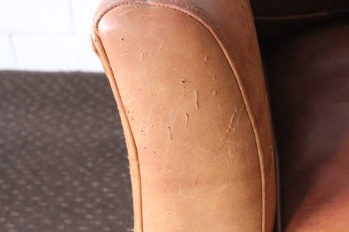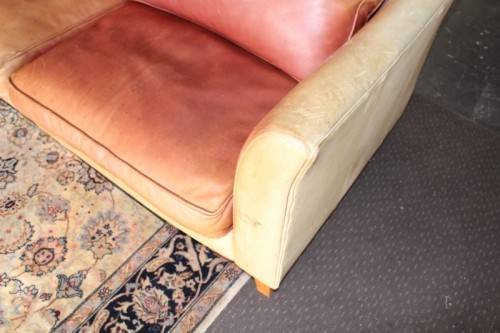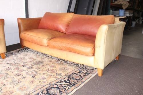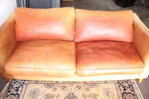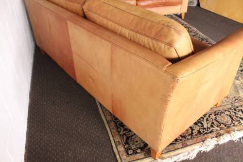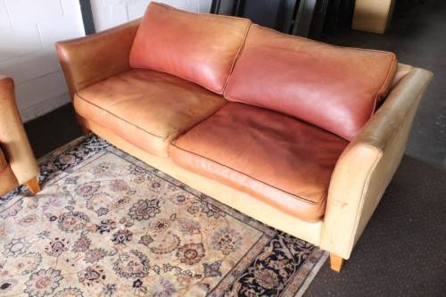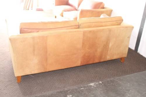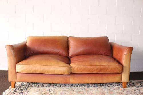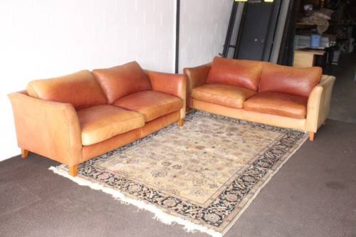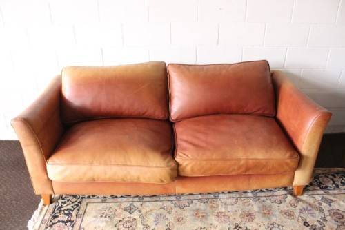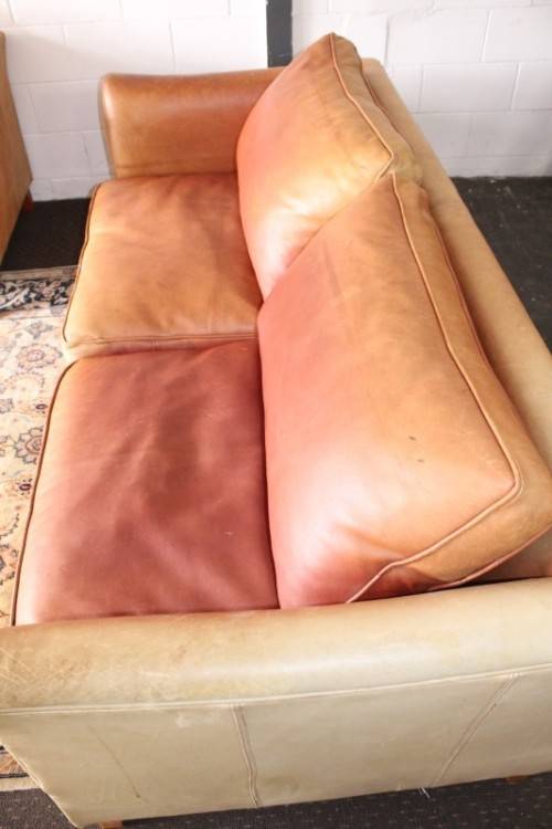 These two stunning and very comfortable large genuine full-grain tan leather (pig skin) couches with removable cushions each measure 198cm long x 88cm wide x 75cm high. The couches are well made have very good weight to them. The leather on both the couches has some sun bleaching/ discolouration. The stitching on the leather is still intact and there are no tears or cuts in the leather that I can see. Both the couches have cat claw scratches as shown in the pics, but saying that, I understand that the leather can be "shaved" and redyed which would also help for the sun bleaching if you wanted them to have a more uniform look. The couches would be perfect for a covered patio or living room. Please view the pics carefully to fully appreciate these two leather couches and to confirm the condition. Please view the shipping options or request courier costs prior to purchasing any of our products.