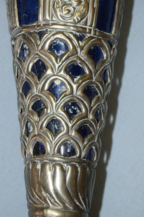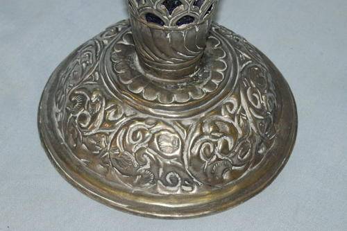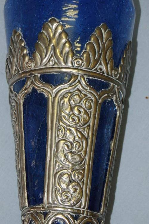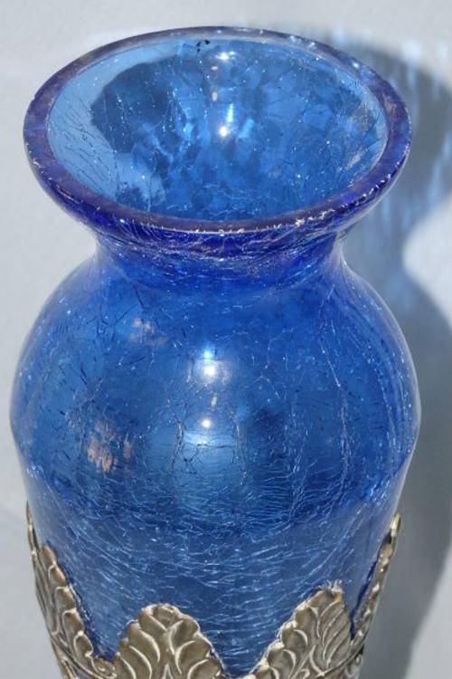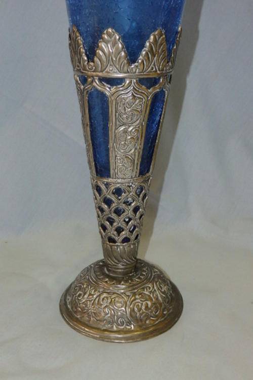 THESE TWO AMAZING HAND BLOWN "TALL" CRAQUELE GLASS COBALT BLUE GLASS VASES HAVE A STUNNING HAND CHASED NICKEL PLATED (I THINK) METAL CASING/ STAND AROUND THEM AND EACH VASE MEASURES 34cm TALL. THE VASES ARE IN FANTASTIC CONDITION WITH NO CHIPS OR CRACKS (AS STRANGE AS THAT SOUNDS; PLEASE SEE BELOW). THE HAND CHASED DETAILING AND THE METALWORK DETAILING GIVE THESE VASES A NORTH AFRICAN/ MOROCCAN FEEL. THESE ARE TRULY STUNNING AND VERY UNUSUAL VASES.