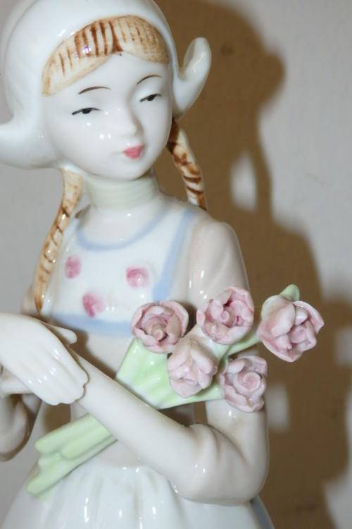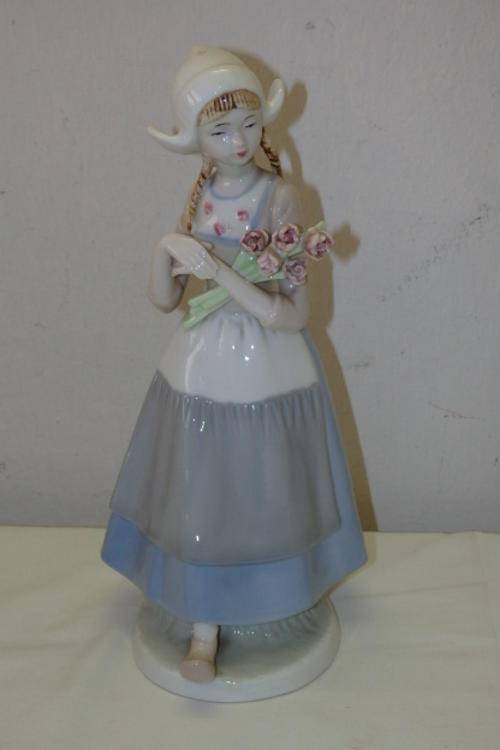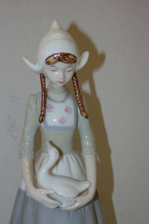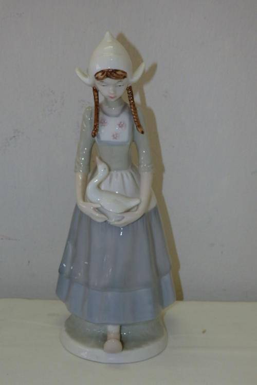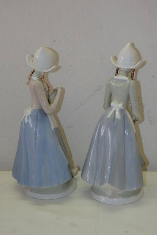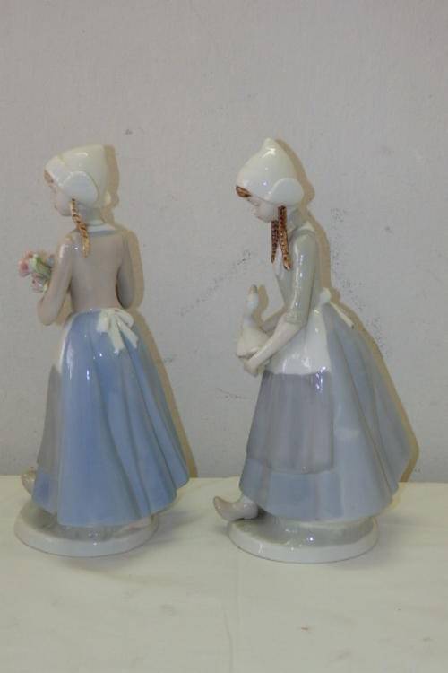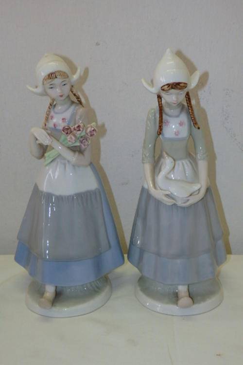 THESE TWO STUNNING ORIGINAL HAND PAINTED HERITAGE PORCELAIN TRADITIONAL "DUTCH GIRLS" FIGURINES ARE IN FABULOUS CARMS AND THE OTHER IS CARING A DUCK. THERE ARE NO CHIPS OR CRACKS IN EITHER OF THE FIGURINES.
