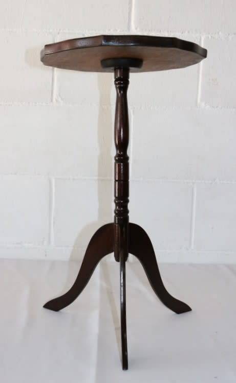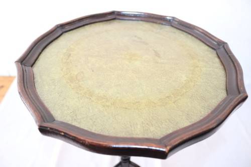 These two awesome leather-top style tri-foot occasional/ coffee tables are in great condition for their age and each table measures roughly 29.5cm across x 51cm high. The tables have fair vintage wear and tear and the scalloped edges are still completely intact and there are no tears or rips in the faux leather tops. These wonderful lightweight occasional tables would be ideal as display tables for a feature piece in a foyer or entrance hall or for a beautiful table lamp. Please view the pics carefully to fully appreciate these stylish occasional tables and to confirm their condition.
