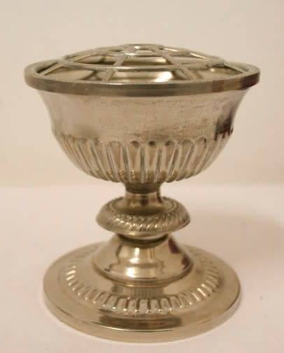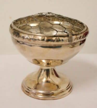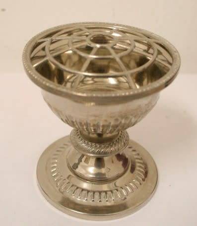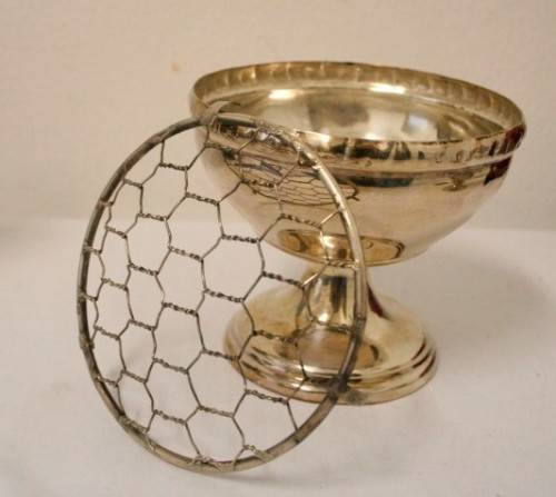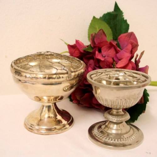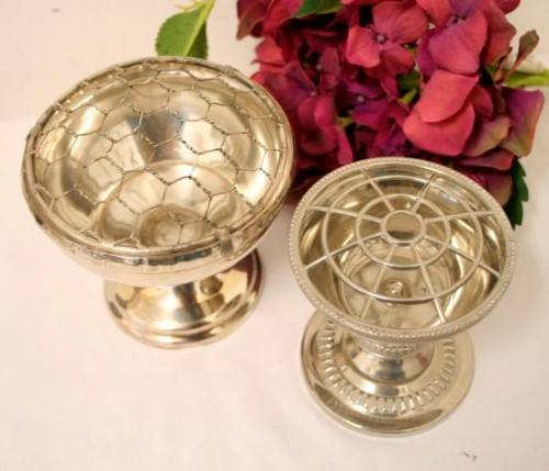 These stunning vintage silver plated flower frogs with a removable mesh lid measure 8cm and 9cm high. There is some age and usage related wear and tear and tarnish. The flower frogs are ideal for a fuller posy bunch of flowers, especially on a formal or brides table. Please view the pics carefully for the general condition of the flower frogs. Please view the shipping options or request courier costs prior to purchasing any of our products.