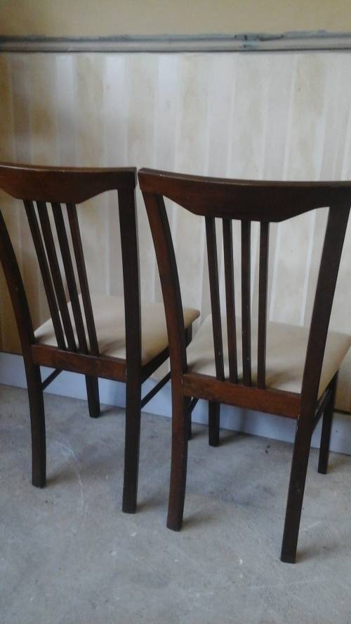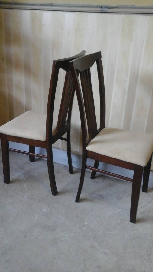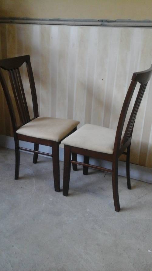 TWO SUPERB ANTIQUE LOOKING DARK WOOD AND FABRIC DINING ROOM CHAIRS, AWESOME DETAILING.