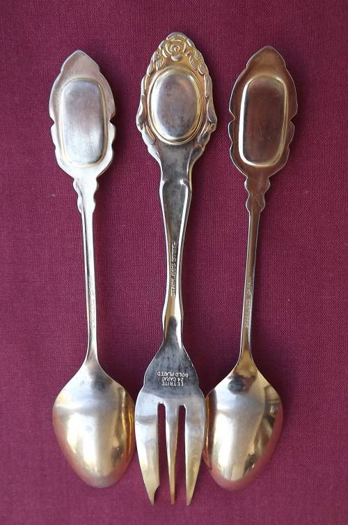 Two teaspoons and 1 cake fork 24 caract gold plated with porcelain decoration
