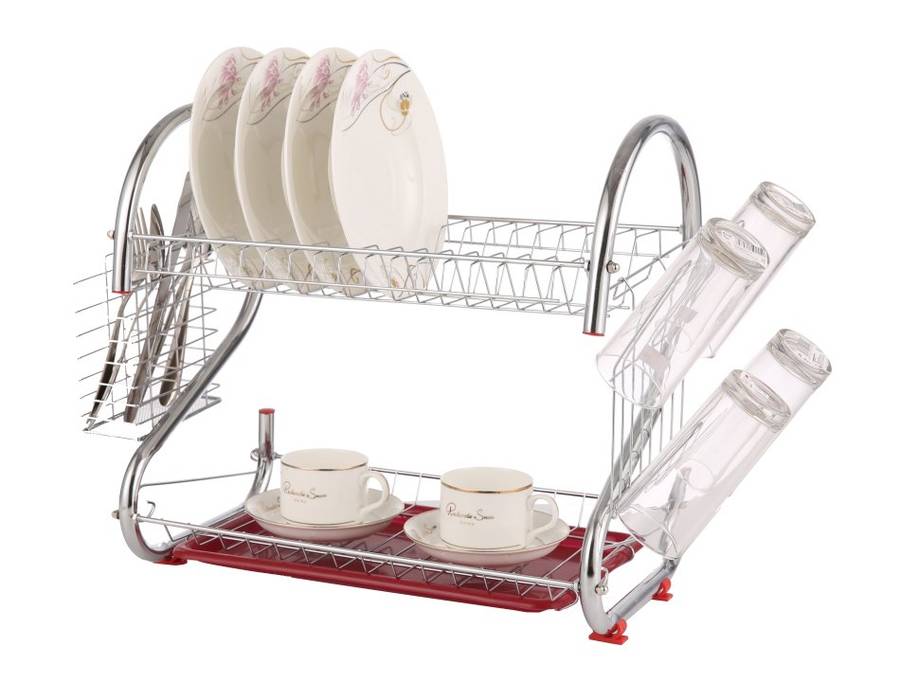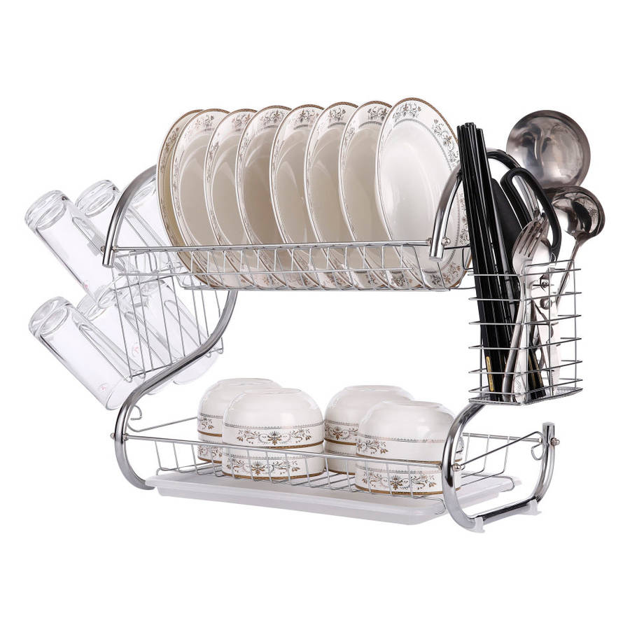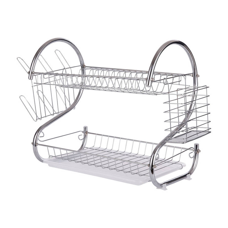 Optimize your countertop while you dry more dishes at one time in a compact area. This space-saving chrome-plated rack features two tiers for dish-drying and a plastic drip tray to protect your countertop. Includes rack to hold your utensils and sponges and handy bottom shelf where you can dry your cookware