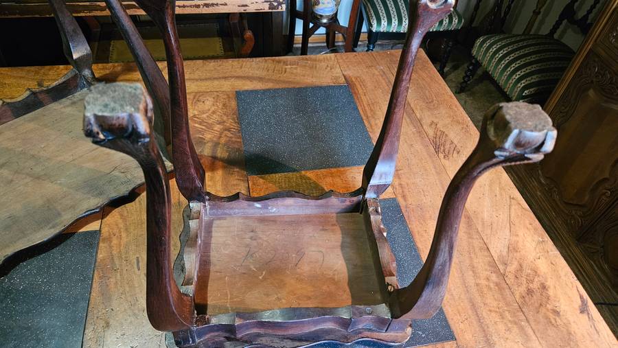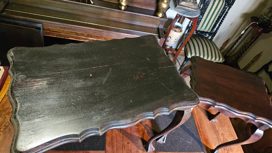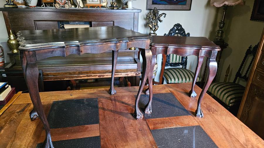 The large table has one piece missing and there were repairs done on the paws as per photos. The smaller table is in a much better condition, also had repairs on the foot pieces. Please see all photos supplied. Selling as is.