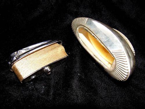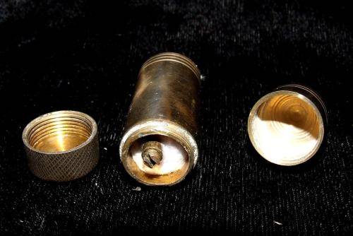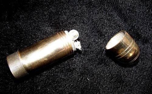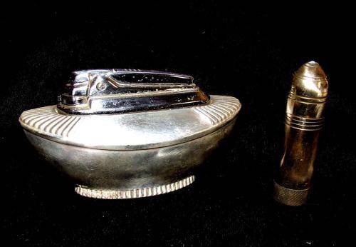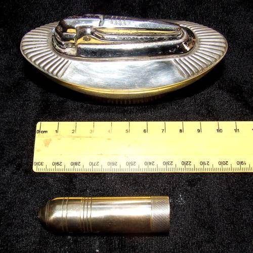 A silver plated Ronson desk gas lighter of unknown vintage. I assume it has no flint as there is no friction when triggered. Minor loss of plating and specs on the chrome parts but can be polished up to a nice item for the collector. Brass cylinder fuel lighter. Vintage also unknown but similar design tinder boxes were part of the cargo of the shipwreck "Quanza" 1872. No flint but appears to be in a very good condition and a unique piece for the lighter collector. Paxi R60, Postnet R90
