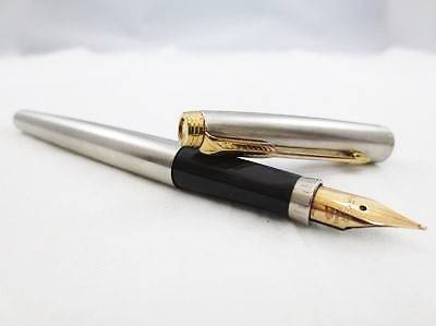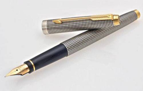 A pair of vintage 1970's Parker fountain pens in as new condition with original Parker 75 box. One pen is the classic sterling silver, the other stainless steel. Both have gold trim in extremely good condition. The silver has tarnished over the years, but I can clean it to make it as new if required. Buyer's choice.