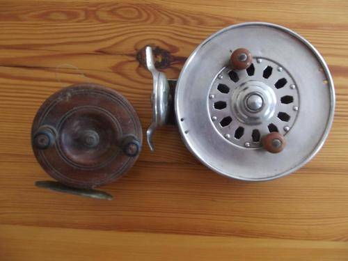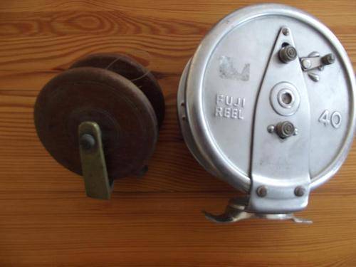 On offer is two very collectable vintage reels. A Stainless steel Fuji Reel no 40, 11.5 cm across and used for fly fishing. A vintage wood and brass reel with no markings and is about 7cm across.