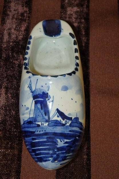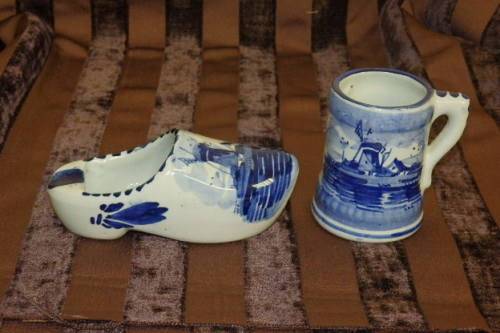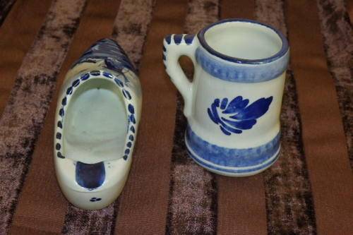 THESE TWO WONDERFUL DELFT BLUE OF HOLLAND COLLECTIBLE PORCELAIN ORNAMENTS ARE IN AWESOME CONDITION AND HAVE NO CHIPS OR CRACKS IN THEM. THERE IS MINIMAL AGE AND USAGE RELATED WEAR AND TEAR. THE CLOG-ASHTRAY IS 12cm LONG AND THE MUG IS 7cm HIGH