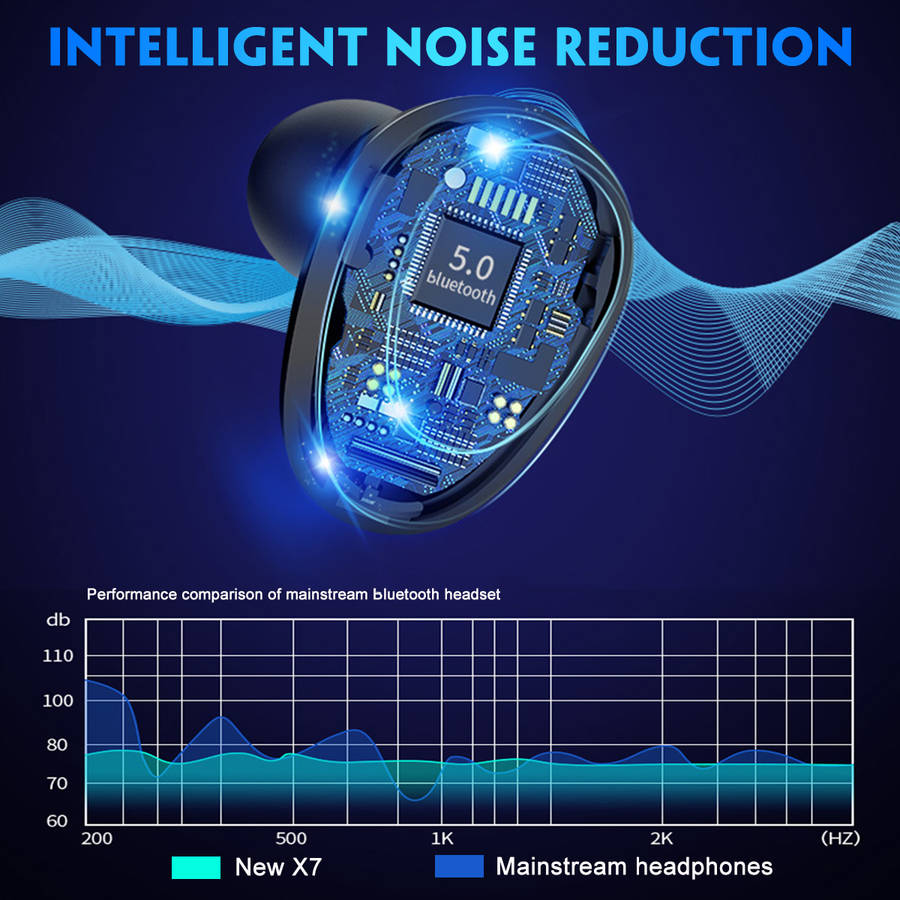 ? - Model: X7 - bluetooth version: 5.0 - bluetooth profile: A2DP, AVRCP, HFP; HSP - Transmission distance: 60 meters - Working voltage: 3.1-4.2V - Charging voltage: 5V 1A - Call time: 4-8 hours - Cumulative playback time: 120 hours - Charging time(Headphone): 30-45 minutes - Charging time(Charging box): 2-3h - Charging box capacity: 2200 mAh - Frequency range: 2402 MHZ~2480 MHZ - Functions: bluetooth music playback, bluetooth calls (answering/hanging/rejecting), voice playback products, smart matching mobile phones, tablets (compatible with Android, Apple and other systems ) - Charging mode: Headphone Charging: Put the headphones in the charging bin and cover them, and the headphones will be charged automatically. Headphones are charged normally when the red light flickers, full of long bright red lights. Charging Box Charging: After connecting the data line, the LED display indicates that charging is completed, and the LED display shows that 100% is full. ? Package Included: