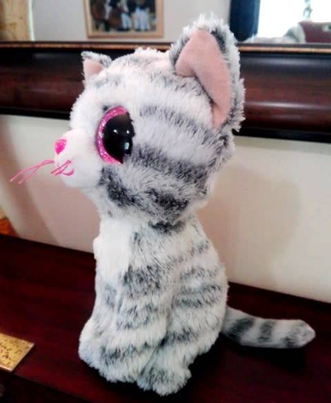 Kids and collectors alike will love this Kitty! Featuring a smooth grey stripey coat, pinkish ears. This adorable pink, sparkling, doe-eyed stuffed toy has synthetic beans that allow it to sit upright on flat surfaces. Kiki is a friendly companion suited for both playtime and bedtime!