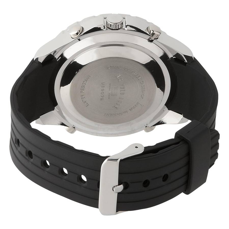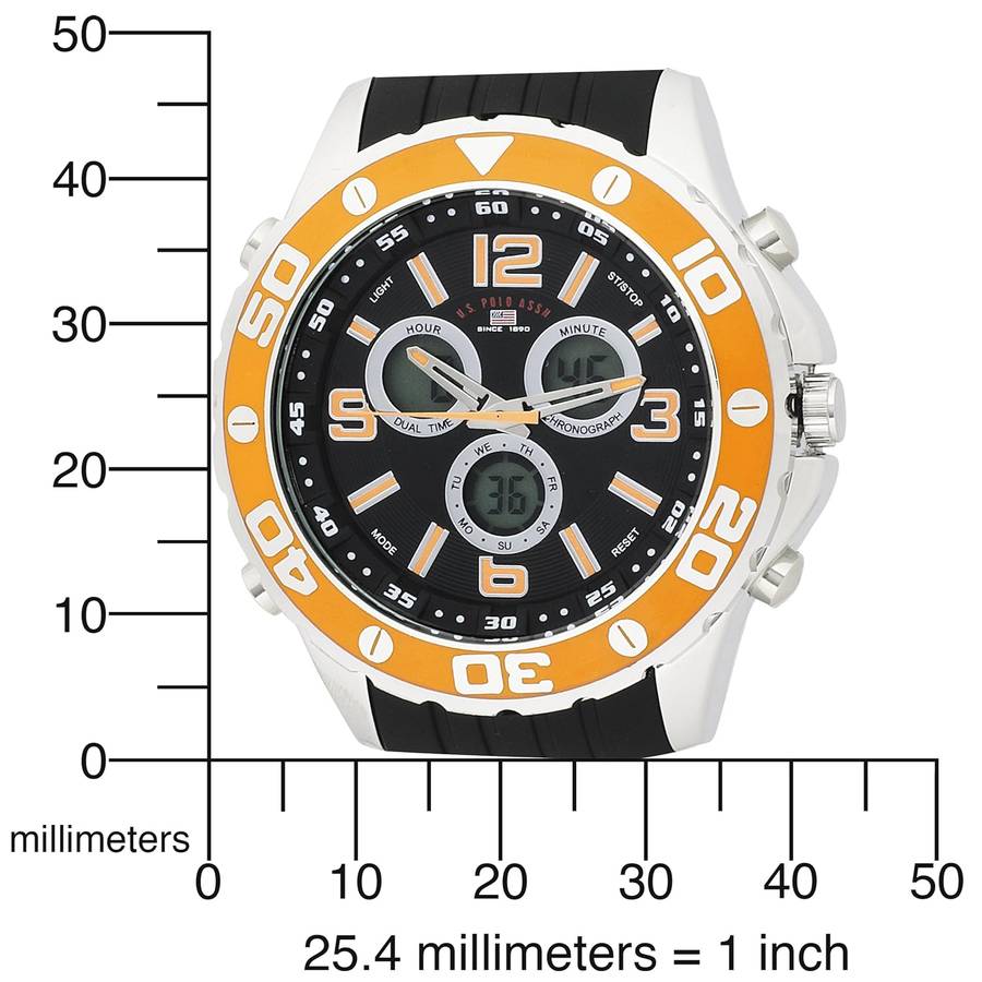 Brand Name: U.S. Polo Assn. Model number: US9072 Part Number: US9072 Dial window material type: Mineral Clasp: Buckle Case material: Metal Case diameter: 48 millimeters Case Thickness: 13.3 millimeters Band material: Rubber Band length: mens-standard Band width: 24 millimeters Band Color: black Dial color: black Bezel material: Metal Bezel Function: stationary Calendar: day-date-and-month Special Features: chronograph, dual-time-display, stop-watch, timer Movement: Japanese-Quartz