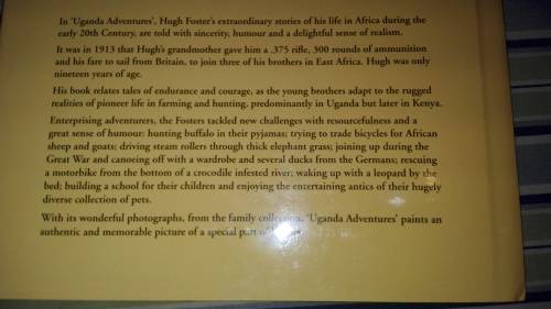 " In 'Uganda Adventures', Hugh Foster's extraordinary stories of his life in Africa during the early 20th Century, are told with sincerity, humour and a delightful sense of realism.It was in 1913 that Hugh's grandmother gave him a .375 rifle, 300 rounds of ammunition and his fare to sail from Britain, to join three of his brothers in East Africa. Hugh was only nineteen years of age.His book relates tales of endurance and courage, as the young brothers adapt to the rugged realities of pioneer life in farming and hunting, predominandy in Uganda but later in Kenya. Enterprising adventurers, the Fosters tackled new challenges with resourcefulness and a great sense of humour: hunting buffalo in their pyjamas; trying to trade bicycles for African sheep and goats; driving steam rollers through thick elephant grass; joining up during the Great War and canoeing off with a wardrobe and several ducks from the Germans; rescuing a motorbike from the bottom of a crocodile infested river; waking up with a leopard by the bed; building a school for their children and enjoying the entertaining antics of their hugely diverse collection of pets.With its wonderful photographs, from the family collection, 'Uganda Adventures' paints an authentic and memorable picture of a special part of history. "