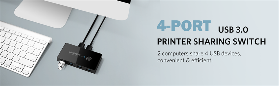 This uGreen 2 In 4 Out USB 3.0 Sharing 4 Port USB Switch Box is an excellent choice to share 4 USB devices between two computers. It's ideal for sharing a printer or scanner in a small office environment. It's also great for use at home if you have multiple PCs or Macs. The uGreen 2 In 4 Out USB 3.0 Sharing Switch Box  supports ultra-fast USB3.0 data transfer rates of up to 5Gb/s. The USB3.0 switch is backward compatible with USB2.0 and USB 1.1 devices. Easily switch between systems via push buttons. The switch allows you to connect and share 4 external USB devices.
