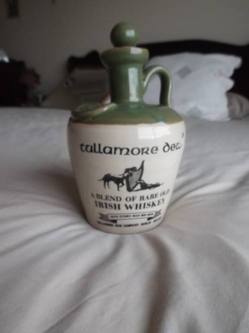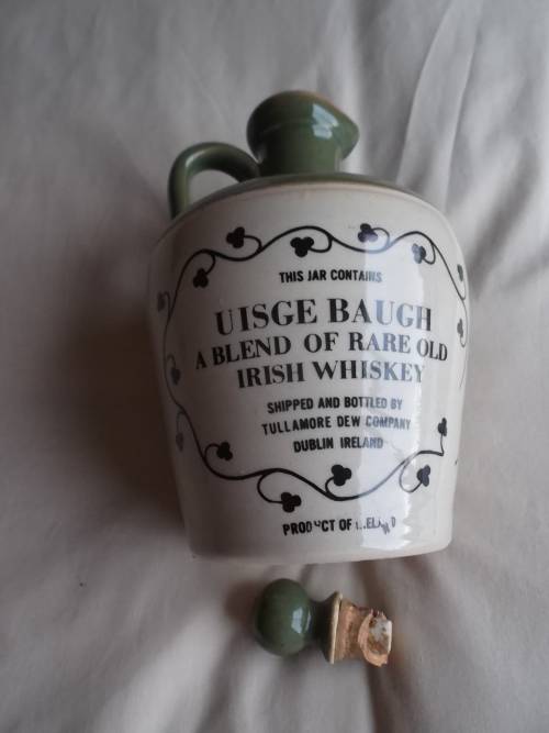 Very Old Empty Jar. Uisge Baugh a blend of rare old Irish Whiskey. Tiny chip under stopper and little off cork broken off. Other than that, in brilliant condition. Post Net R130.