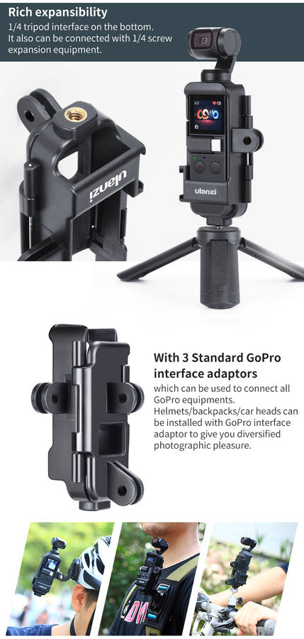 Package weight: 0.06 kg Features: Light weight, easy to carry Portect your DJI OSMO Pocket gimbal camera from damage Support extention, can be attanched to 1/4 tripods, sellfie sticks With 3 Go Pro standart adapter, can be mounted to action camera accessories Package Included: 1 x Ulanzi OP-7 Protective Frame