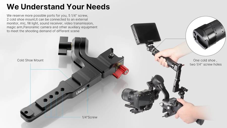| Features: HandGrip Mode, dual handheld shoot, greatly reduce the burden of handheld grip No need to split, just turn the knob to adjust and switch the top handle grip mode Reserve more possible ports for you, 5 1/4in the screw, 2 cold shoe mount It can be connected to an external monitor, mic, fill light, sound receiver, video transmission, magic arm, Panoramic camera, and other auxiliary equipment to meet the shooting demand of the different scene Quick-release module for easy storage, the entire handle is designed with a quick-release module for more convenient storage Specifications: Brand: Ulanzi Name: Multi-shape foldable handheld Grip Model: R083 Compatibility: DJI Ronin RSC2 and RS2 Material: Aluminum Alloy + Leather Texture Battery Info: No battery used Dimensions: 4.52 x 6.69 x 6.22in (115 x 170 x 158mm) Weight: 12.48 oz (354g) Package Included: 1 x R083 Foldable Handle Grip Ulanzi 1 Year Limited Warranty