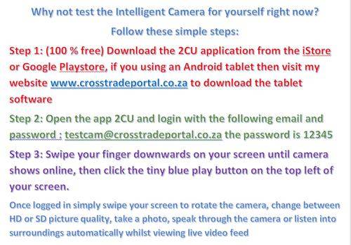 Feel free to contact me at anytime if you need assistance testing the Intelligent Camera or have any questions : 062 152 2393