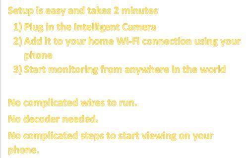 Installation is simple, simply download the free app to your phone, tablet, PC or iPad, plug in the Intelligent camera and connect it to your home wifi connection, that's it, 3 simple steps, it literally takes less than 2 minutes to setup.