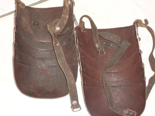 These are super rare used all the way up to early in the first world war, British army infantry foot armour. If they didn't rust away most were melted down when plated armour became obsolete. Only every seen one other pair in a private collection. These are in surprisingly good condition and even have their original leather straps. Manufactured by CGE.