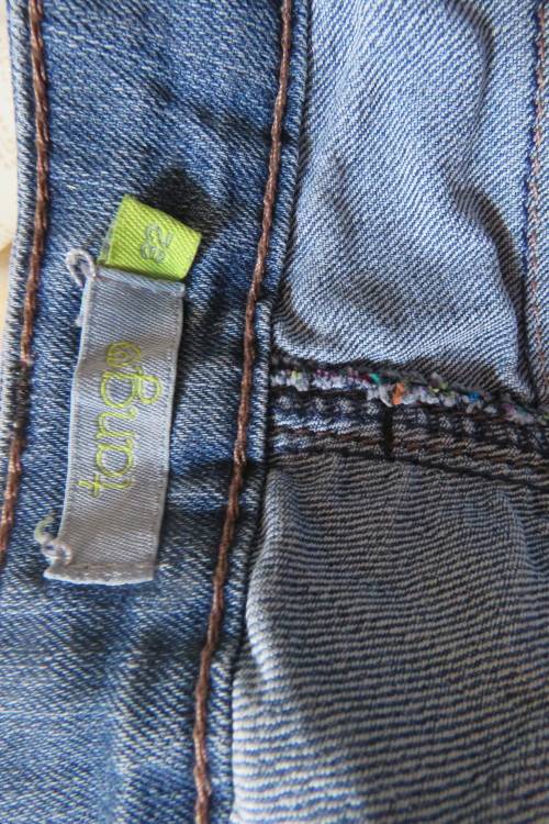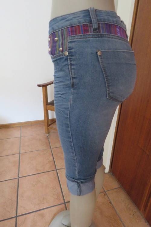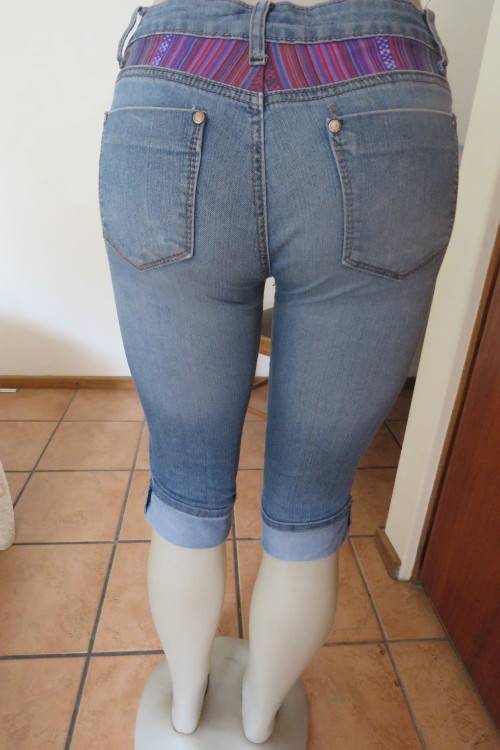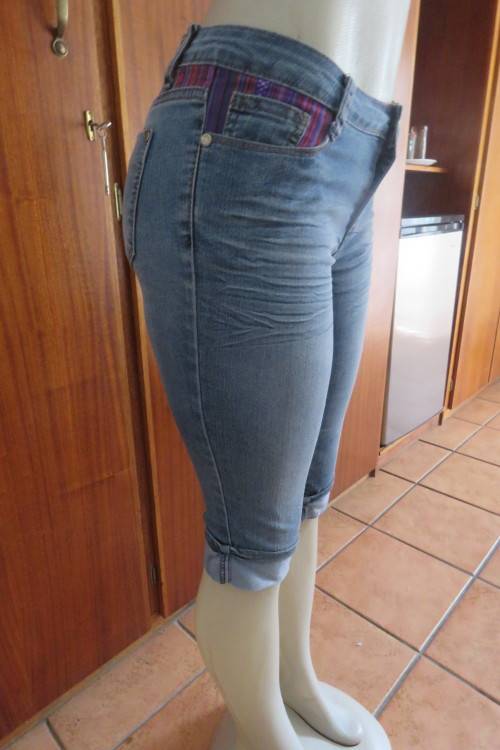 Ultra sexy cropped jeans in blue denim by 'Tango' in size 32/8 Low rise. Pockets back and front. Yoked back with purple stripe inlay Turnover legs. In cotton stretch fabric. As new.