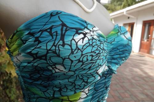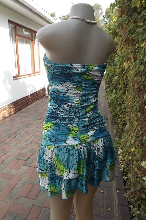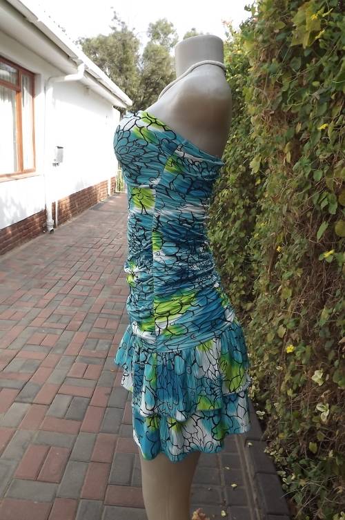 Ultra sexy IDENTITY strapless dress size 30/6 in blue/green and white floral.Build in bra.Gathered sides and back double frilled seam.In 100% polyester fabric.As new