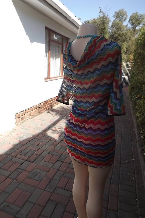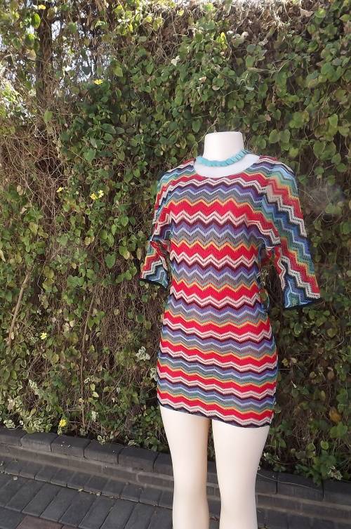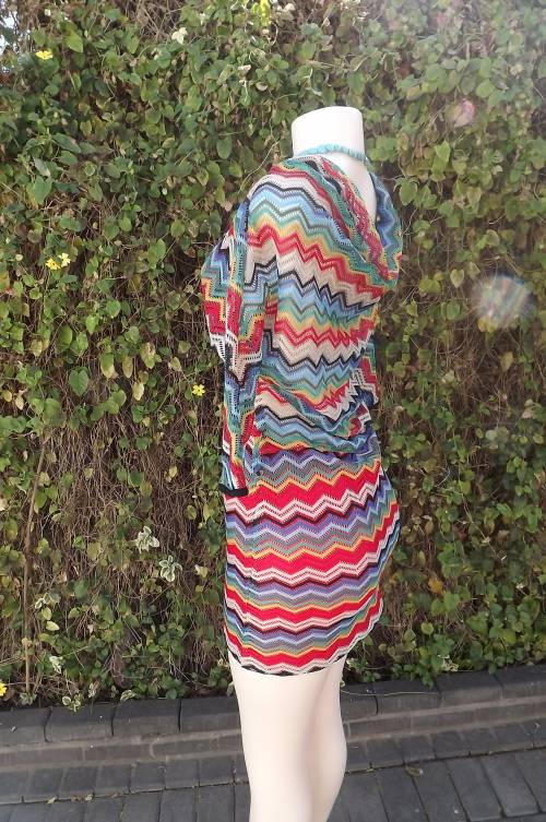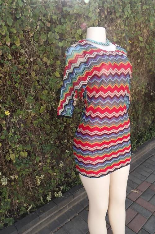 Ultra short colourful mini dress un zig zag horizontal lines.Size 31/7.Lined elbow length sleeves