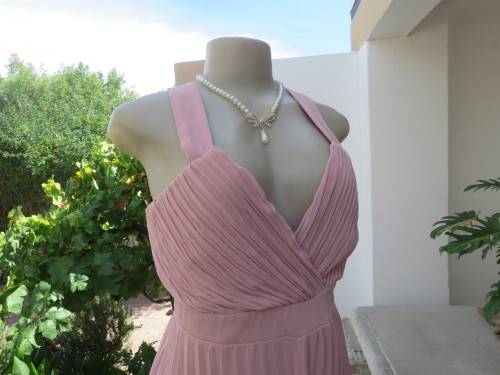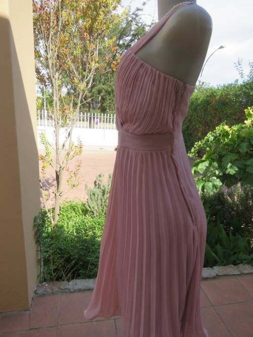 Ultra smart and sexy dusty pink evening dress.Size 42/18.'OASIS' by 'FOSCHINI'.Permanent pleated skirt accordion style with lining.Pleated crossover top front.Shoulder straps and band in middle.Lining in stretch polyester and dress in sheer polyester.Zip at side.New condition.