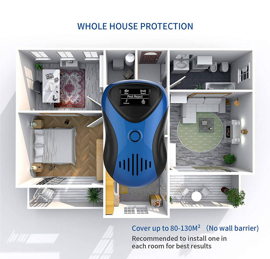 Place the ultrasonic pest control 7.5-39.5 inches from the ground, simply plug in our electronic insect repellent and it will do the rest with 4 modes to expel indoor pests of 860-1400 ft². The ultrasound is 360 degree all around coverage, let mice and other pests have nowhere to hide (Tip: Please make sure that the pest repellent ultrasonic port is not obstructed by furniture, electrical appliances or wall when in use).