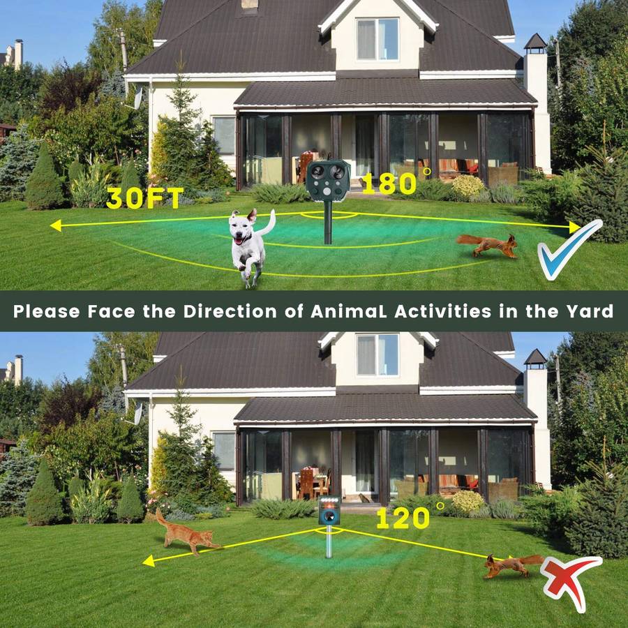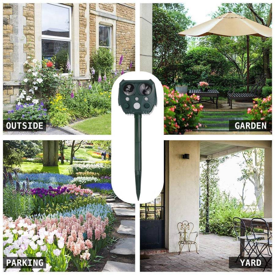 Description: 5-Modes Ultrasonic Animal & Pest Repeller Solar Powered Outdoor Pest Repellent,Motion Activated with Solar Power Flashlight and USB Charge,Effective for Cats,Dogs,Raccoons,Skunks, Squirrels and More