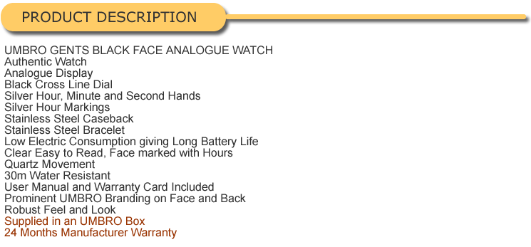 UMBRO AUTHENTIC GENTS BLACK DESIGNED FACE ANALOGUE WATCH - IMPORTED FROM EUROPE **BRAND NEW!!!**