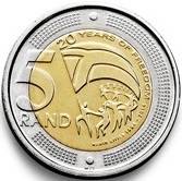 2014 20 Years Of Freedom R5 coins. Very scarce coin. Hardly seen. Coins are in uncirculated condition and preserved in zip-loc bags. Bid is per coin. Generic image below. Bid per coin to take your selected quantity.