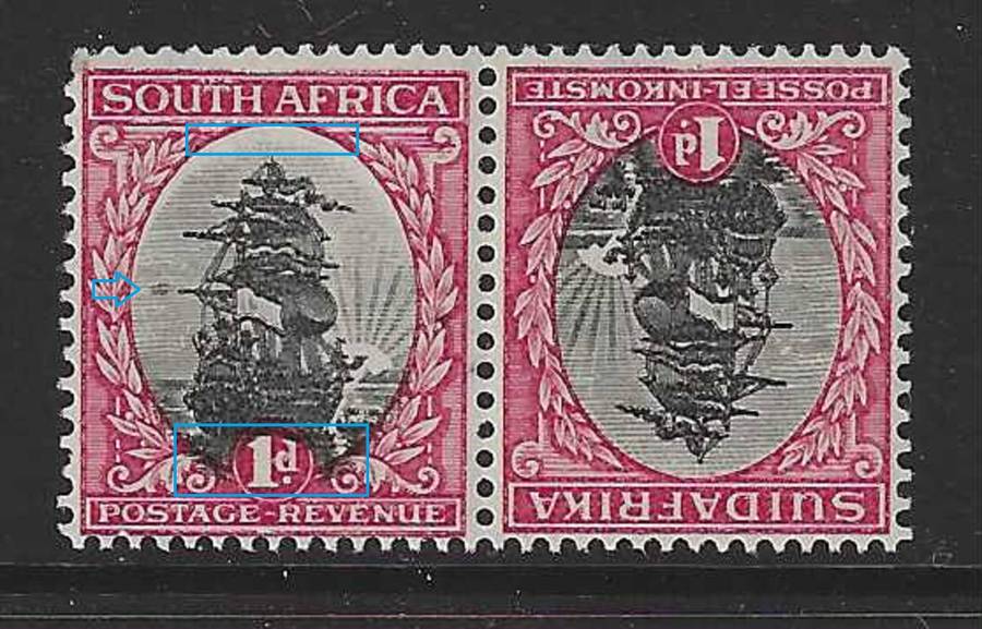 MNH 1d tete-beche pair with varieties UHB V4 and vignette shifted down. CV for pair before taking into account varieties is R 50,000