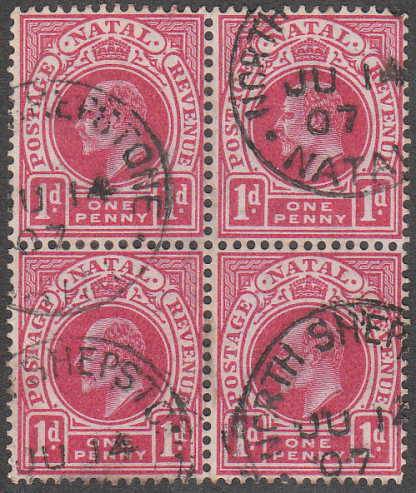 Natal 1907 (Ju 14) Rare (Putzel) North Shepstone postmarks on Natal KEVII 1d block of 4. This PO was only opened between 1902 and 1907 when it closed, it re-opened in 1925 Lot is sold for postmark and not for condition of stamps which might have small faults.
