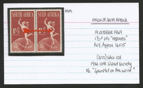 UNION OF SA 1 1/2d UPU MM WITH LISTED VARIETY V6 ON CARD. SEE DESCRIPTION