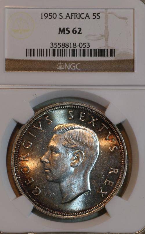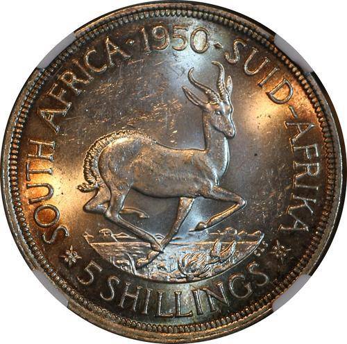 UNION OF SOUTH AFRICA 1950 FIVE SHILLINGS (5S) NGC GRADED MS62