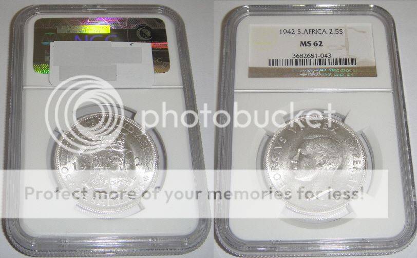 Union of South Africa : Half Crown (2/6-) of 1942 : NGC graded MS62